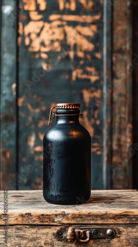 bottle, black, matte, copper, cap, metal, rustic, wood, surface, background, texture, vintage, old, aged, dark, shadow, light, object, container, drink, beverage, design, style, material, product, photo, image, picture, still, life, detail, craft, closeup, single, vertical, brown, grunge, aesthetic, element, item, view