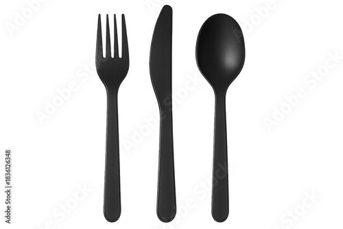 cutlery, plastic, flatware, fork, knife, spoon, eating, tableware, disposable, black, dinnerware, dining, meal, kitchen utensile, eatery, cafeteria, fast, food, convenience, picnic, camping, travel, service, utensil, lunch, dinner, breakfast, event, party, catering, set, collection, essential, modern, contemporary, clean, simple, isolated, studio, shot, overhead, vertical, object, product, everyday, item, single, use, eco