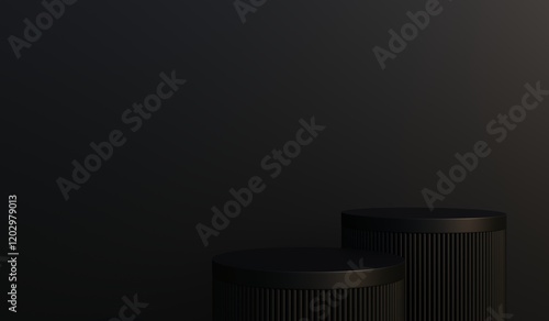 Black podium, black background, for displaying fashion products, cosmetics, spas, perfumes, various premium creams, 3D renderings.