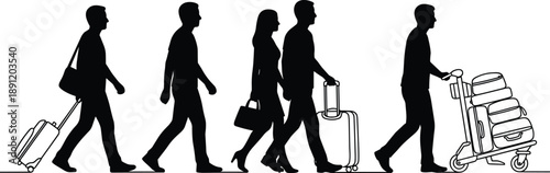 Black silhouette vector of travelers walking with luggage, men and women pushing suitcases and trolley in airport, isolated on white background for travel design.