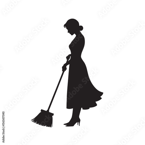 Black Silhouette Vector of Woman Sweeping Floor with Broom in House Cleaning Scene on White Background Full Ultra HD