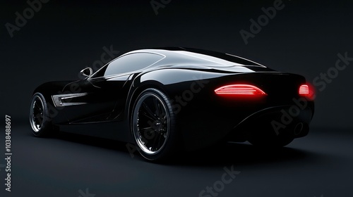 Black sports car on a dark background, viewed from the rear, with red tail lights.