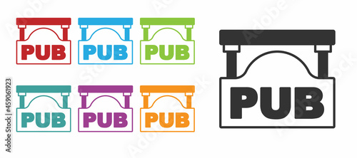 Black Street signboard with inscription Pub icon isolated on white background. Suitable for advertisements bar, cafe, restaurant. Set icons colorful. Vector