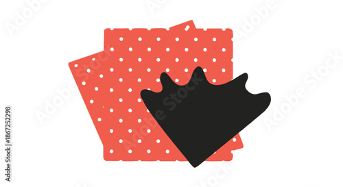 Black stylized duck footprint overlays two overlapping coral polka dot paper sheets.