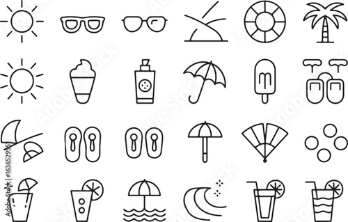 summer, vacation, travel, beach, sun, black, icon, collection, symbol, holiday, silhouette, set, isolated, vector, design, graphic, illustration, white, background, abstract, tropical, exotic, season, sunny, fun, relax, sea, ocean, nature, resort, destination, tour tourism, trip, journey, sand, palm, tree, sunglasses