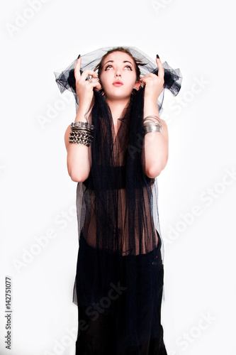 woman, tribal, ethnical, dancing, esoteric, mystical, movement, fashion, contemporary, young, pretty, alternating, heartthrob, symbol, softer, delicate, tulle, sail, black, grieving, sad, dead, gothic, orient, black, gesture, cool, baggy, gem, bracelet, buckle, eared, sensual, relaxed, background, white, background, sensuality
