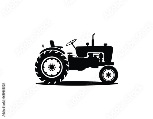 Black tractor silhouette isolated on white backdrop showcasing agricultural machinery and farming equipment for countryside themes and rural landscapes