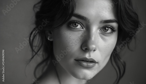 Black, white portrait of beautiful caucasian woman with sensual look, natural skin. Brunette hair, studio photo. Attractive female face with freckles, soft shadows, dark background. Beauty, fashion,