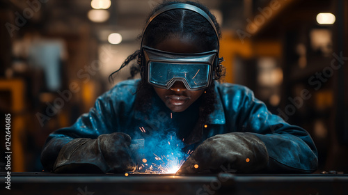 Black woman welder in protective gear working with sparks flying in industrial workshop showing skilled trade and manufacturing