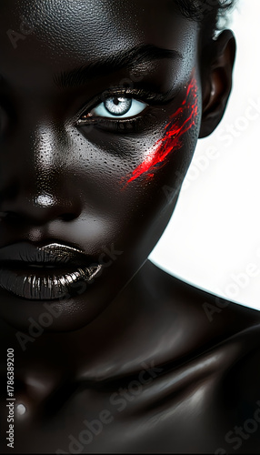 Black woman with striking blue eyes and red face paint closeup