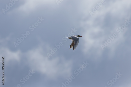 Black-headed gull flying past in a cloudy sky, black-headed gull from the side in a gray sky, Chroicocephalus ridibundus, black-headed gull in flight in a gloomy sky