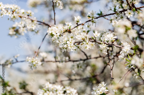 Blackthorn. Blooming blackthorn in springtime. Spring bushes with soft focus and blurry. Blue sky. Nature wallpaper blurry background. Soft focus.