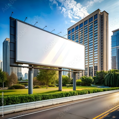 billboard, blank, empty, advertisement, advertising, marketing, urban, city, city landscape, building, modern, skyscraper, street, road, asphalt, green, tree, grass, park, signage, poster, banner, creative, graphic design, corporate, business, branding, brand, promotional, commercial, city life, modern architecture, empty space, city landscape, promotion, display, design element