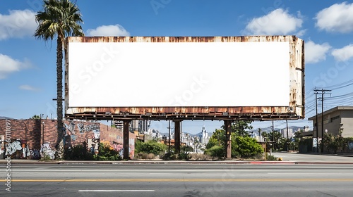 billboard, blank, empty, advertising, urban, street, city, signs, poster, advertisement, marketing, communication, visual, media, display, promotion, message, space, vacant, empty space, commercial, exterior, rust, weathered, rust-eaten, metal, road, city landscape, building, palm, tree, sky, sunny, day, daylight, photo, image, template, graphic, design, creative, large, campaign, branding, town, real estate