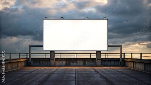 billboard, blank, white, empty, rooftop, concrete, railing, metal, pole, cloudy, sky, dramatic, overcast, advertising, space, copy, modern, urban, industrial, platform, structure, construction, evening, sunset