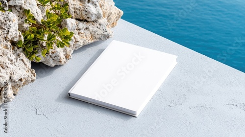 Blank book by pool, ocean view, summer relaxation