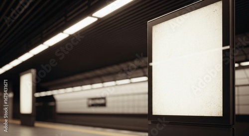 billboard, screen, display, advertisement, advertising, signs, signage, digital, blank, empty, template, mock-up, copy, space, message, communication, subway, subway, station, platform, underground, tunnel, urban, city, public, transport, transportation, transit, light, illuminated, bright, dark, modern, clean, minimalist, vertical, rectangle, frame, glow, line, ceiling, wall, floor, business, marketing, promotion, commercial, technology