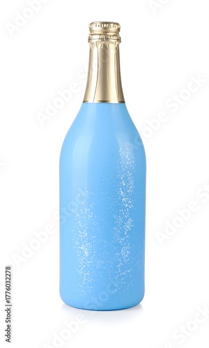 Blank Light Blue Champagne Bottle with Gold Cap and Glitter Effect Isolated on White Background – Elegant Sparkling Wine or Celebration Beverage Mockup for Branding and Luxury Design