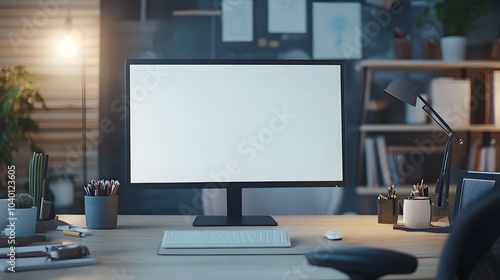 Blank mockup template of a desktop computer monitor on a creative designer's desk.