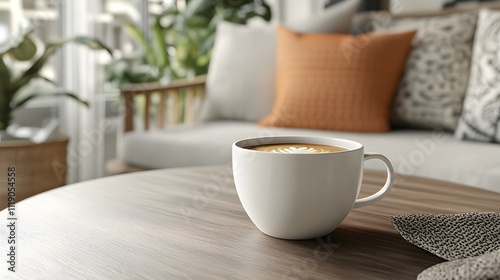 Blank mockup template of a matte-finish coffee cup on a smooth wooden table, with cozy ambiance and soft cushions around.