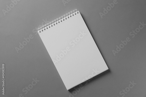 Blank notebook on light grey background, top view. Mockup for design