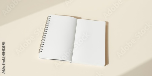 Blank spiral notebook open on a beige surface, illuminated by soft sunlight casting gentle shadows.