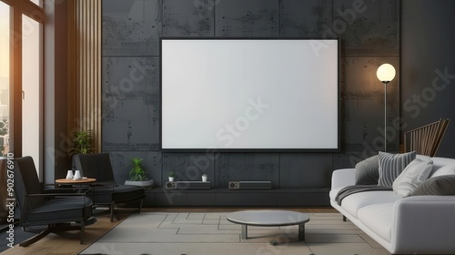 Blank TV screen in a modern living room, home entertainment setup mockup