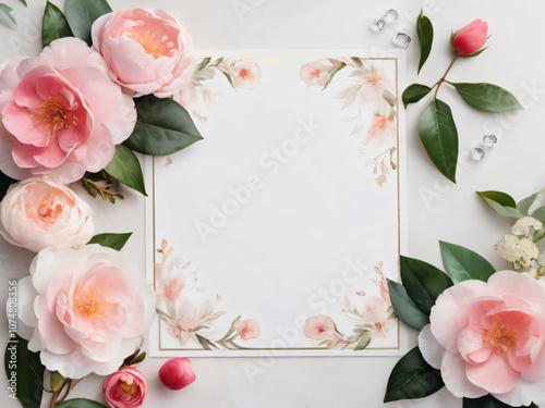 Blank wedding invitation surrounded by watercolor flowers.