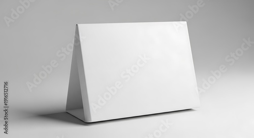 Blank white triangular display stand on a light gray studio background, perfect for showcasing information or artwork