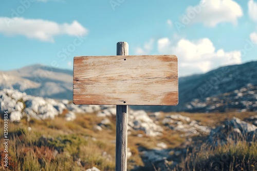 Blank Wooden Signpost in Scenic Natural Landscape with Mountain and Sky