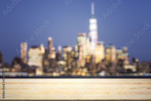 Blank wooden tabletop with beautiful blurry skyline at night on background, mockup