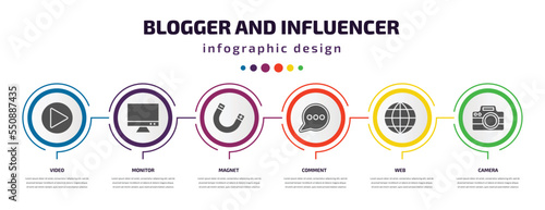 blogger and influencer infographic element with filled icons and 6 step or option. blogger and influencer icons such as video, monitor, magnet, comment, web, camera vector. can be used for banner,