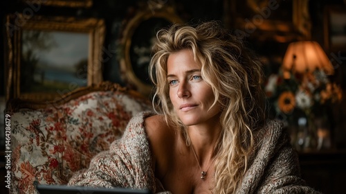 woman, blond, hair, portrait, contemplative, thoughtful, serious, looking away, indoor, antique, room, chair, furniture, vintage, elegant, stylish, beautiful, model, fashion, lifestyle, home, interior, cosy, relaxed, calm, serene, pensive, daydreaming, interior design, home decor, beautiful woman, comfortable, luxury, rich, old-fashioned, classic, art, painting, table, tablet, screen
