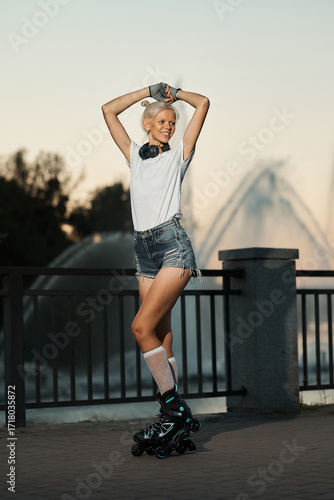 rollerblade, woman, blond, skate, outdoors, fountain, park, summer, active, lifestyle, happy, smiling, joy, fun, recreation, leisure, sport, exercise, fitness, youth, young adult, short, t-shirt, earphones, arms raised, hands up, sunlight, daytime, urban, city, street, pavement, stylish, fashion, casual attire, activewear, body, figure, movement, expression, positive, energy, well-being, beauty, attractive, posing