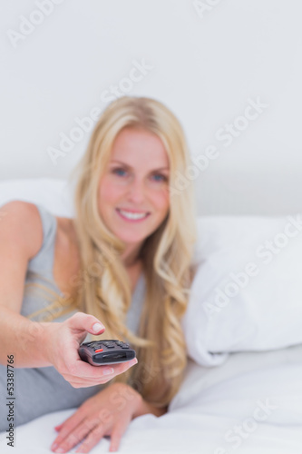 Blonde woman pointing the remote control at the camera
