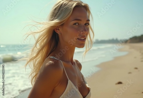Blonde woman stands by ocean or sea, enjoying sun and surf while wearing a stylish swimsuit, highlighting relaxed beach atmosphere. Beautiful young face. Advertisement for clothes or beach travel. AI