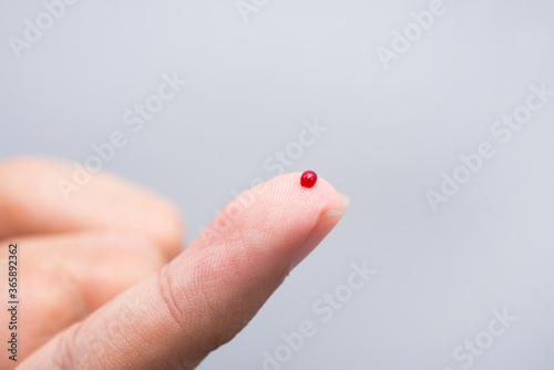 Blood drop on fingertip prepare for checking the glucose level with a glucometer for examining diabetes mellitus.