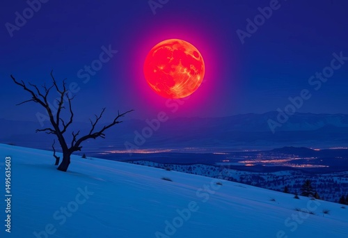 Blood red moon ascends over snow-covered desert, silhouetted tree, distant city lights, alien, texture