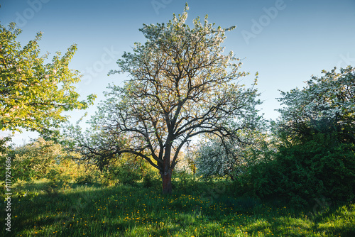Blooming apple orchard and green grove with dandelions on a sunny day. Photo wallpaper.
