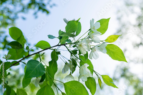 blooming branch of an apple tree against the background of leaves, sunlight, and blue sky, apple blossom, it's time for flowering,