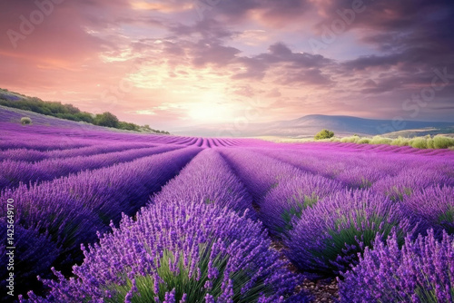 Blooming lavender field at sunset creating a stunning landscape