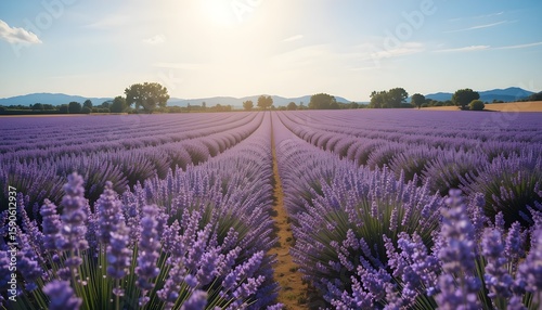 Blooming lavender field in Provence with soft sunlight and blue sky