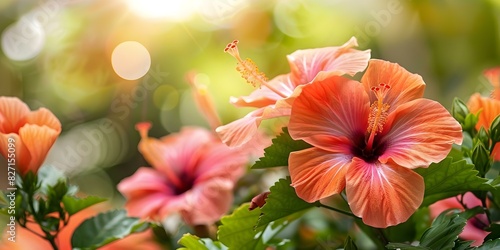 Blooming magenta hibiscus flowers on lush green bush in summer garden. Concept Gardening, Flowers, Summer, Nature, Landscaping