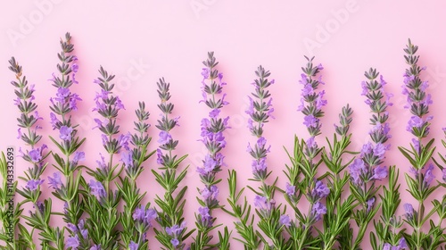 Blooming rosemary on pink background Salvia rosmarinus Vertical Topic herbs de Provence