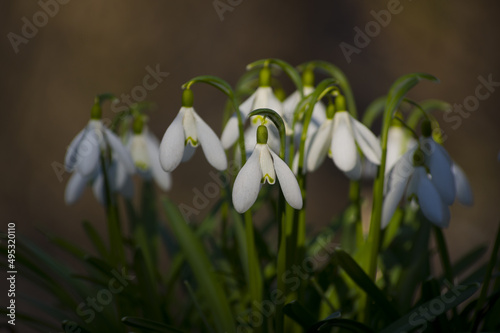 Blooming spring snowdrops in the forest in golden hour