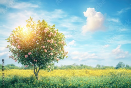 spring, summer, nature, blossom, tree, flower, field, sky, cloud, sun, light, bright, vibrant, colourful, peaceful, serene, beautiful, landscape, wildflower, grass, yellow, pink, green, growth, fresh, sunshine, radiant, flora, fauna, scenic, calm, tranquil, bloom, vegetation, outdoors, springtime, idylli, rural, gold, meadow, lush, happy, joyful, paradise, view, picture