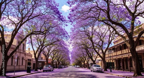tree, city, street, purple, bloom, urban, car, parked, historic, building, vibrant, spring, flower, blossom, architecture, landscape, town, road, transport, vehicle, automobile, season, colourful, beauty, nature, scenic, view, environment, tranquil, serene, peaceful, daytime, sunlight, cloud, blue, sky, leaf, branch, trunk, tree, floral, flora, botanical, garden, park, scenery, atmosphere, mood, feeling