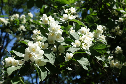 Blossoming branch of Philadelphus coronarius against blue sky