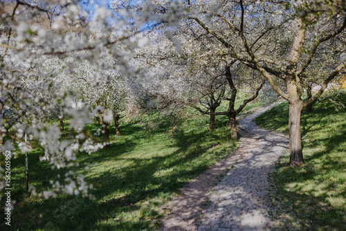 bloom, blossom, tree branch, branch, cherry blossom, cobbled, czech, floral, flower, flower, garden, green, landscape, leaf, nature, outdoors, park, path, peaceful, flower petals, prague, scenic, shade, spring, sunlight, trail, tranquil, tree, tree, walk, white