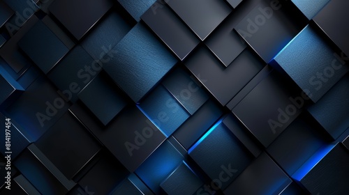 Blue and black 3D rendering of squares with neon blue light between them.
